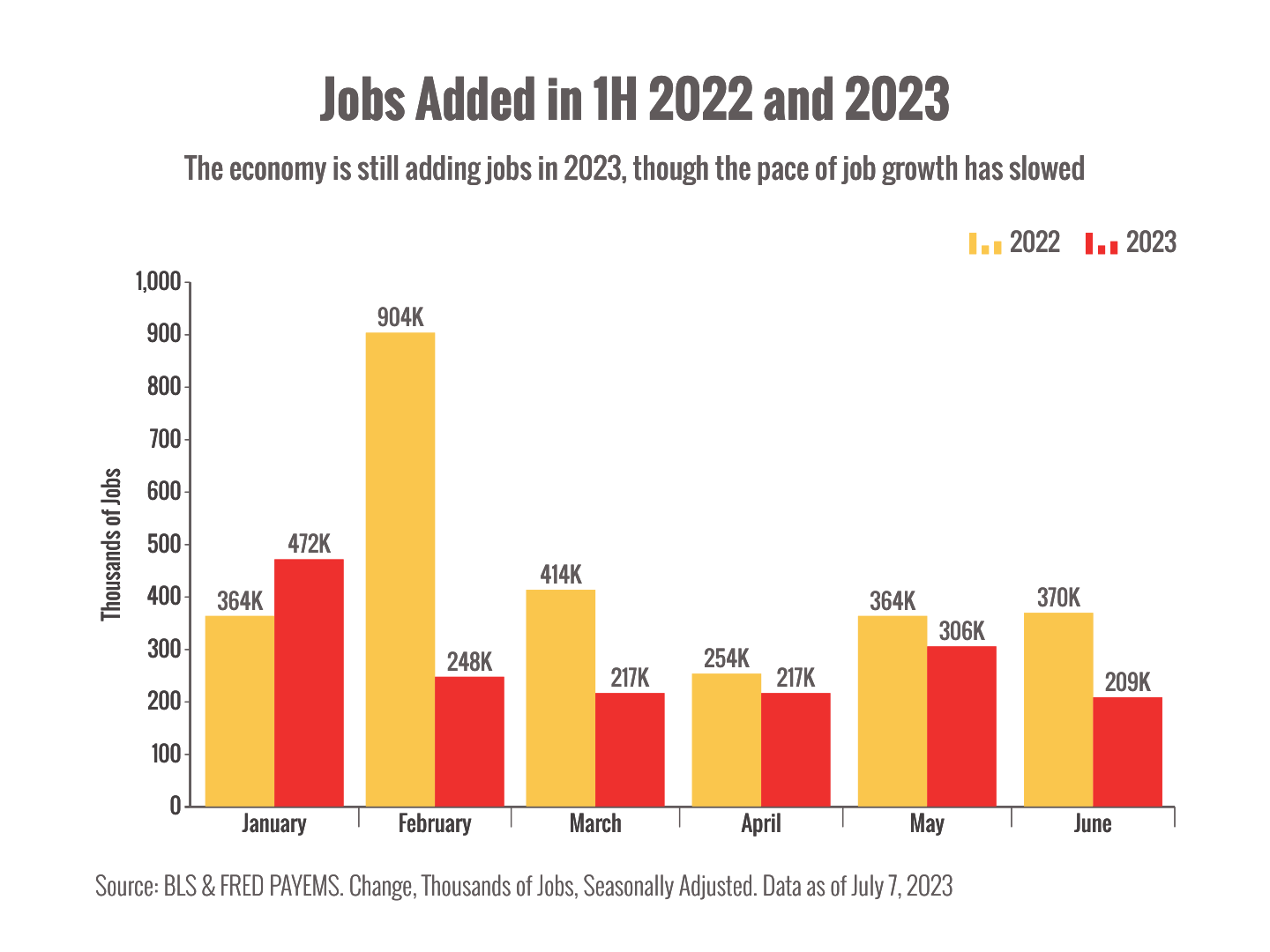All told, the economy has added 1.67 million jobs in 2023 so far.5 That's significantly less than the 2.67 million jobs added in the first half of 2022 but it shows that the labor market still has legs. However, job growth may be cooling in the private sector, which could be a warning sign of a slowing economy.6