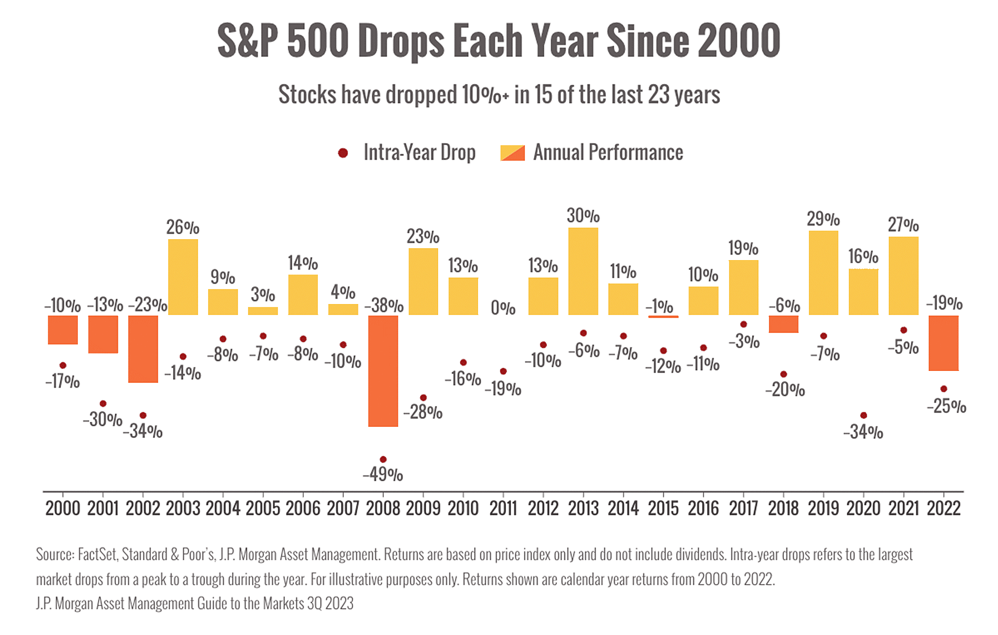 You can see by the red dots that even years with strong market performance experienced some pretty big drops. That's normal and not a reason to worry.